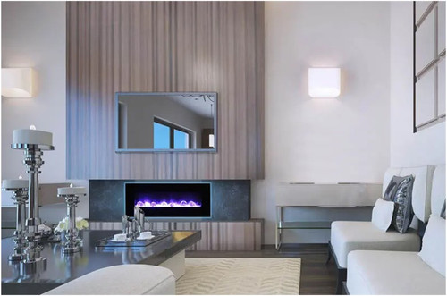 Heat is emitted from a single slot in the face of the surround. 13 colors of surround back-lighting illuminate spaces creating even more ambience. All Built-In Flush Mount / Wall Mount electric fireplaces come standard with a driftwood style log set and optional decorative media of EMBER or FIRE & ICE® decorative media are available for purchase.