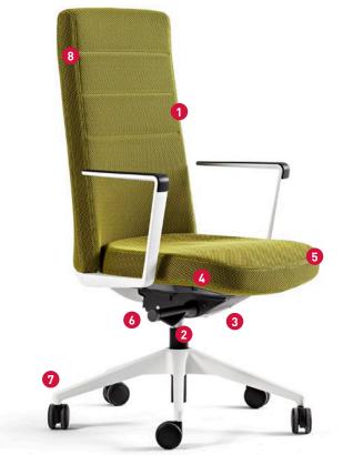 Backrest moulded flexible foam PU flexible (75-80kg/m3) over steel metal frame Ø 1/4” x 1/4” thickness. Upholstered. High backrest model. Auto-weight synchro control mechanism.