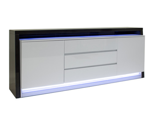 The Domino Buffet in Gray Oak veneer is unique with its gray lacquer edges. The angles side connect to a top that covers an LED light. The buffet offers plenty of storage with three drawers and two doors and rests on a second LED light. Complete the Look: Domino Dining Table, Chairs