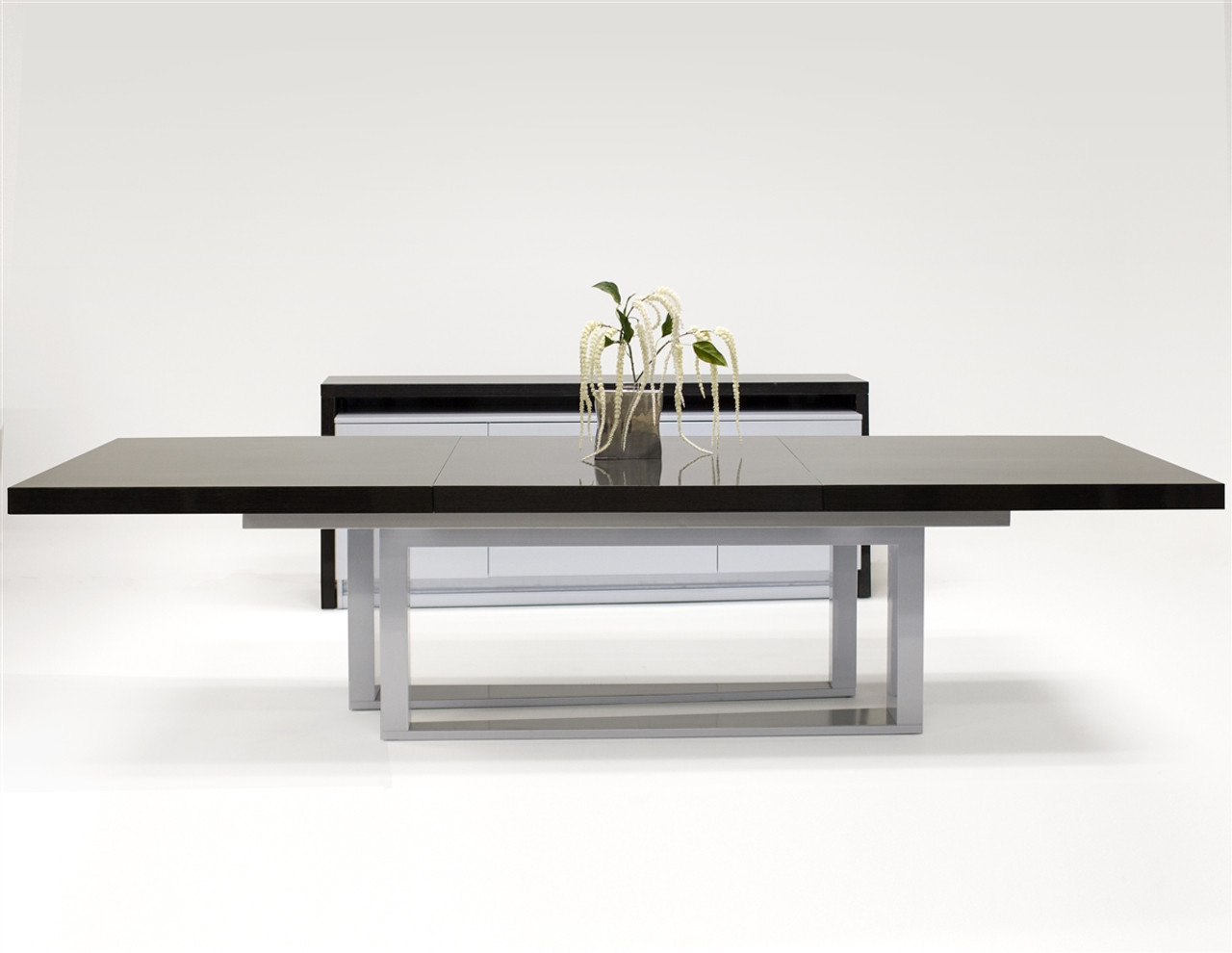 The Domino Dining Table in Gray Oak veneer with clear lacquer is a contemporary, rectangular table that has extensions on each end. Resting on two triangular shaped legs, the base differentiates itself with its gray lacquer finish. Complete the Look: Domino Buffet, Armchair, Chair