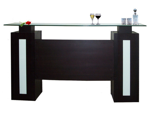 The Elite Bar Counter is both modern and an efficient use of space in any modern living room or entertainment area. The unique sleek lines, the combination of wood, sand blasted glass accent and glass top create a contemporary centerpiece for your home. Featuring a single glass shelf standing behind the bar generates two ample storage spaces for glassware, linens or small appliances. Six smaller cubbies are made for bar accessories, corkscrews and coasters. Complete the Look: Elite Bar Wall | Corner