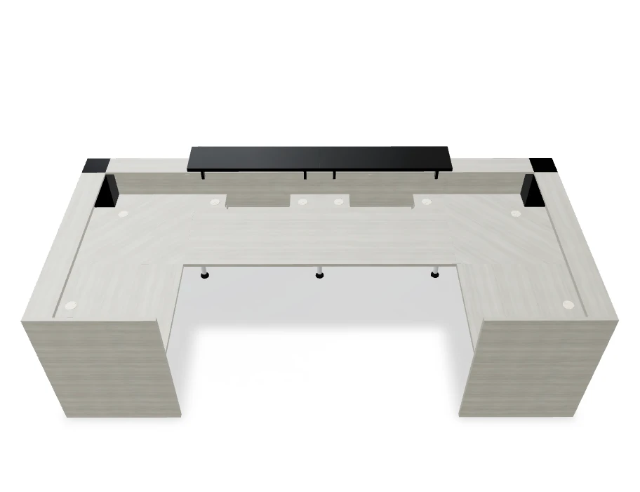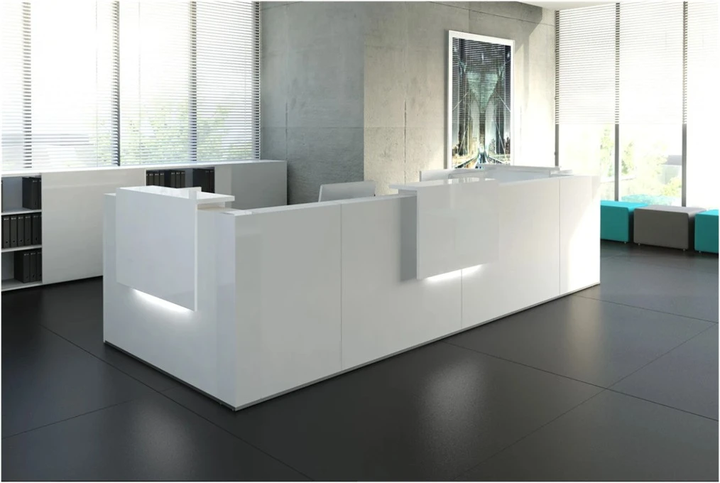 Classic and timeless — The Tera Reception Desk is strikingly beautiful and functional.  Tera reception desk meets the expectations of those who favor simplicity and universal forms. The combination of glossy HPL elements, with white or wood-like melamine plate that breaks the conservative patterns, is subtly indicating elegance and prestige. Modular desk provides possibilities of creating various layouts: from small to complex workstations depending on the needs. By employing the low module with overhang worktop, the desk eases the communication with disabled customers. Tera is a perfect fit for a reception of law firms or hotel lobbies where it delicately highlights the high quality of service.