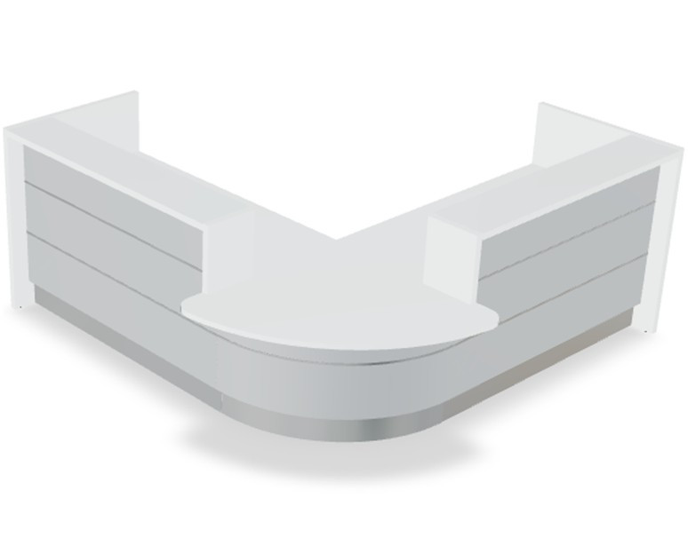 Creating integrity and a free-flowing stylish environment, numerous convex and concave arrangements make up the Valde reception area. An illuminated high gloss surface along with a beautiful HPL front, highlight the fresh white body of the superior workspace reception. Our creative design and cogent elegance are emphasized in our precision and attention to detail. Horizontal slats made of aluminum give the area a modern character. The desk top is made of tempered white glass matches the glittering front portion of the counter. LED lighting located under the upper desk top and at the base of the counter beautifully presents the reception desk in darker rooms. The cool light perfectly harmonizes the white elements of the desk while the colorful front really stands out in the room.