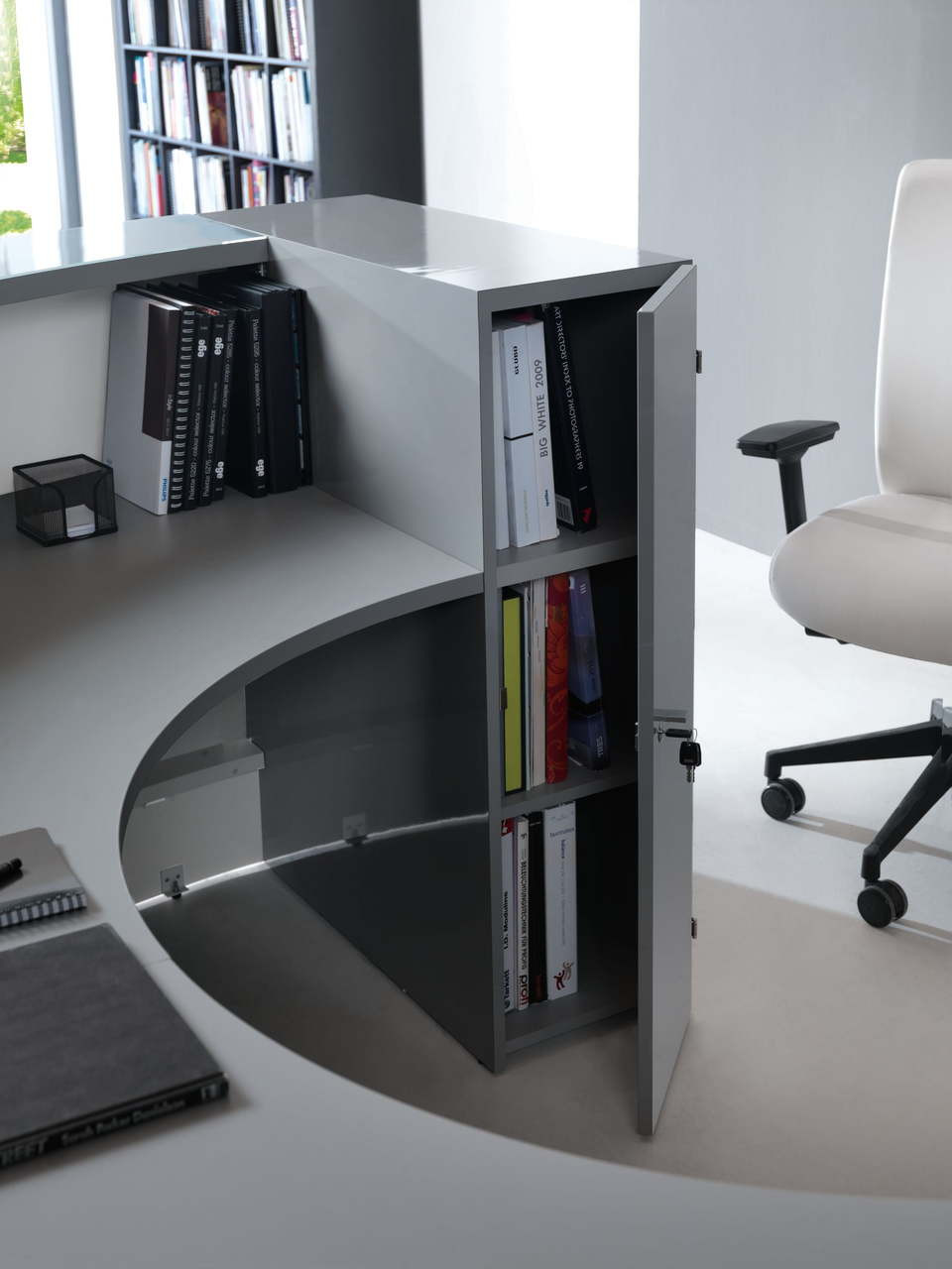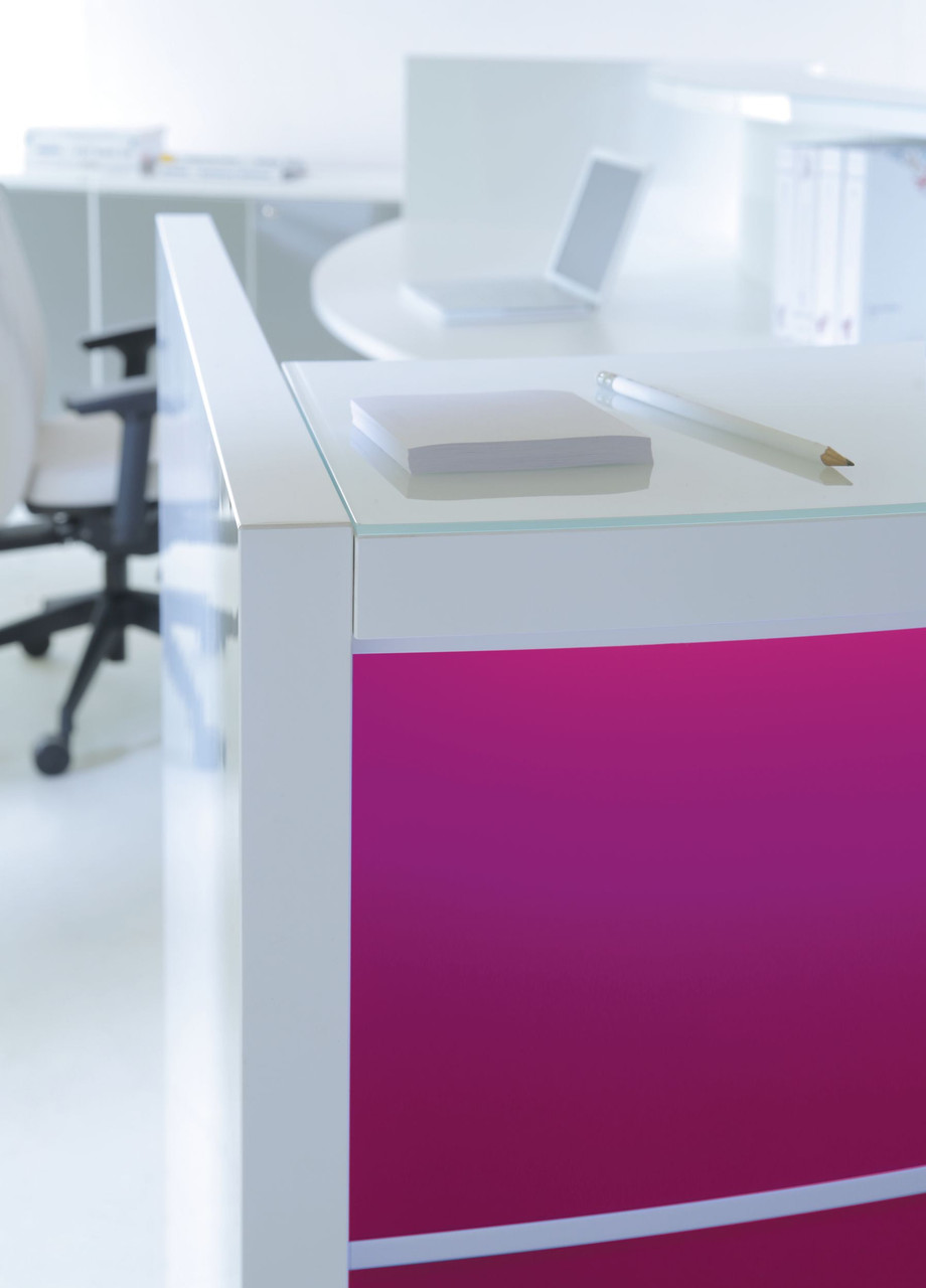 Creating integrity and a free-flowing stylish environment, numerous convex and concave arrangements make up the Valde reception area. An illuminated high gloss surface along with a beautiful HPL front, highlight the fresh white body of the superior workspace reception. Our creative design and cogent elegance are emphasized in our precision and attention to detail. Horizontal slats made of aluminum give the area a modern character. The desk top is made of tempered white glass matches the glittering front portion of the counter. LED lighting located under the upper desk top and at the vase of the counter beautifully presents the reception desk in darker rooms. The cool light perfectly harmonizes the white elements of the desk while the colorful front really stands out in the room.