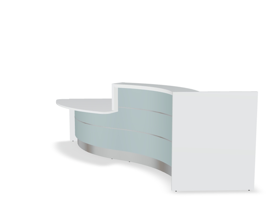 Creating integrity and a free-flowing stylish environment, numerous convex and concave arrangements make up the Valde reception area. An illuminated high gloss surface along with a beautiful HPL front, highlight the fresh white body of the superior workspace reception. Our creative design and cogent elegance are emphasized in our precision and attention to detail. Horizontal slats made of aluminum give the area a modern character. The desk top is made of tempered white glass matches the glittering front portion of the counter. LED lighting located under the upper desk top and at the vase of the counter beautifully presents the reception desk in darker rooms. The cool light perfectly harmonizes the white elements of the desk while the colorful front really stands out in the room.