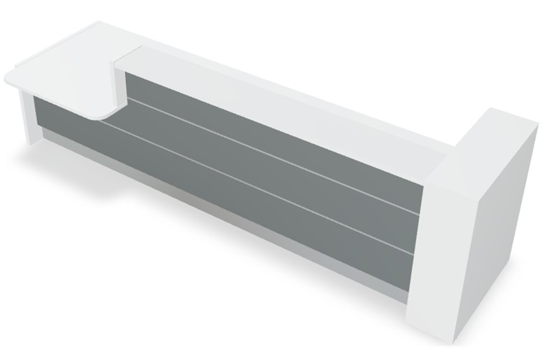 Creating integrity and a free-flowing stylish environment, numerous convex and concave arrangements make up the Valde reception area. An illuminated high gloss surface along with a beautiful HPL front, highlight the fresh white body of the superior workspace reception. Our creative design and cogent elegance are emphasized in our precision and attention to detail. Horizontal slats made of aluminum give the area a modern character. The desk top is made of tempered white glass matches the glittering front portion of the counter. LED lighting located under the upper desk top and at the vase of the counter beautifully presents the reception desk in darker rooms. The cool light perfectly harmonizes the white elements of the desk while the colorful front really stands out in the room.